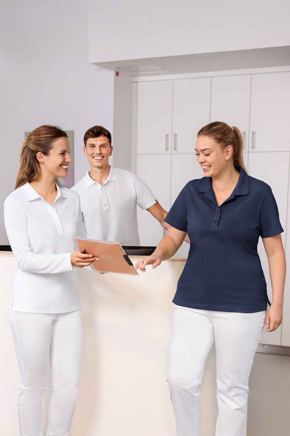 Tuniques à enfiler faciles d’entretien et de coupe sportive pour lui et elle.